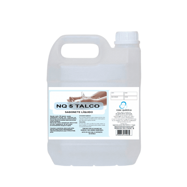 Descrição: NQ 5 Talco é um sabonete líquido com pH neutro e alta espuma. Higieniza as mãos com um toque delicado e sedoso. Possui tensoativos biodegradáveis e perfumes deliciosos. Para aplicação em ambientes especiais como hospitais, centros de saúde, etc. Apresentação: Frasco de 5 litros.