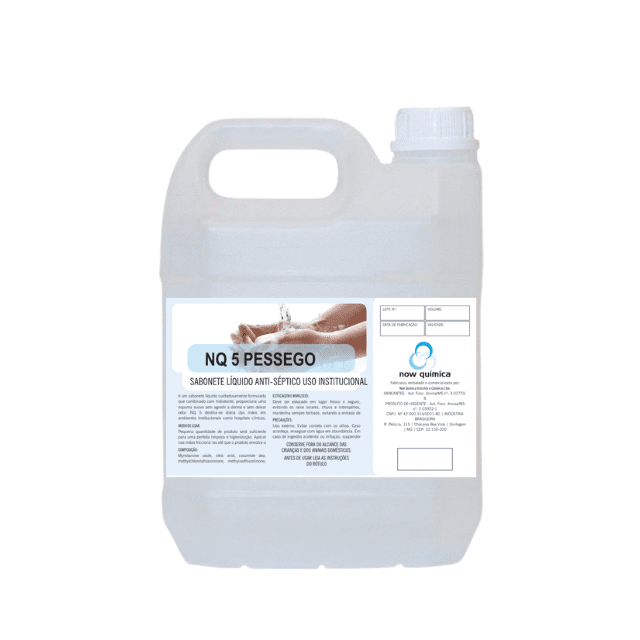 Descrição: NQ 5 Pêssego é um sabonete líquido com pH neutro e alta espuma. Higieniza as mãos com um toque delicado e sedoso. Possui tensoativos biodegradáveis e perfumes deliciosos. Para aplicação em ambientes especiais como hospitais, centros de saúde, etc. Apresentação: Frasco de 5 litros.